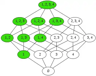 Булеан множини верхня множина позначена зеленим. Вона є простим фільтром.