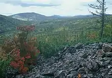 На вершинах найвищих хребтів розташовується холодна арктична пустеля. Нижче по схилах на щебеневих і суглинних ґрунтах з'являється жалюгідна гірсько-тундрова рослинність, заміняється ще нижче чагарниками кедрового сланнику, берези, чагарникової вільхи і полярної верби. На півдні нижні частини схилів гір до висоти 800-1200 м покриті розрідженими модриновими лісами. На схилах південної експозиції численні остепненні ділянки. На алювіальних опідзолених ґрунтах днищ долин крупних річок разом з модриновими лісами зустрічаються ліси, утворені сосною і березою, зрідка ялиною, гаї запашної тополі, а також хащі чагарників.