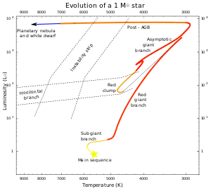 Діаграма Герцшпрунга—Рассела — це графік зоряної світності в порівнянні з температурою поверхні для популяції зірок. Під час фази горіння водню вона перебуває на головній послідовності (діагональна смуга, що перетинає діаграму від правого нижнього до лівого верхнього кута). Коли водень в ядрі буде вичерпано, енергія забезпечується ядерним горінням водню в оболонці навколо ядра. У центрі зорі буде накопичуватися гелієвий «попіл» від цього горіння і вона буде мігрувати вздовж еволюційної гілки на діаграмі, що веде вгору вправо. Тобто температура на поверхні зорі буде зменшуватися, зоря розширюватиметься, а загальне випромінювання енергії (світність) зорі зростатиме у міру збільшення площі поверхні[1].