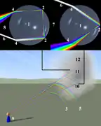 - Через 300 років (після Теодоріха) італійський монах ордену єзуїтів Марко Антоній де Домінус повторював експеримент зі скляною кулею. На підставі спостережень дійшов висновку, що веселка з'являється в результаті відбивання від внутрішньої поверхні краплі дощу і дворазового заломлення променів — при вході в краплю і при виході з неї. За життя єзуїт видав у Венеції трактат «Про райдугу зору та світла» (1611 р.). Після смерті монаха, його тіло спалили разом з трактатом;[4]