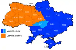 ![]() Результати виборів за регіонами. Синім позначено регіони, де переміг Кучма. Жовтогарячим позначені регіони, де переміг Кравчук. | ||||