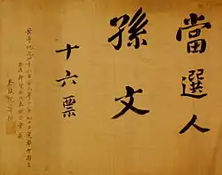 Після початку Учаньского повстання 10 жовтня 1911 року в Нанкіні зібрався тимчасовий уряд, щоб обрати президента. З трьох висунутих кандидатів, Сунь Ятсен, Хуан Сін і Лі Юаньхун, Сунь отримав 16 голосів, для перемоги на виборах. Праворуч наведені офіційні результати виборів, що оголошують про вибори Суню 10 листопада 1911 року.