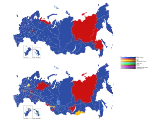 ![]() Попередні результати виборів. Верхня карта показує партії, які перемогли в суб'єктах федерації. Нижня карта показує партії кандидатів, які перемогли в одномандатних округах.