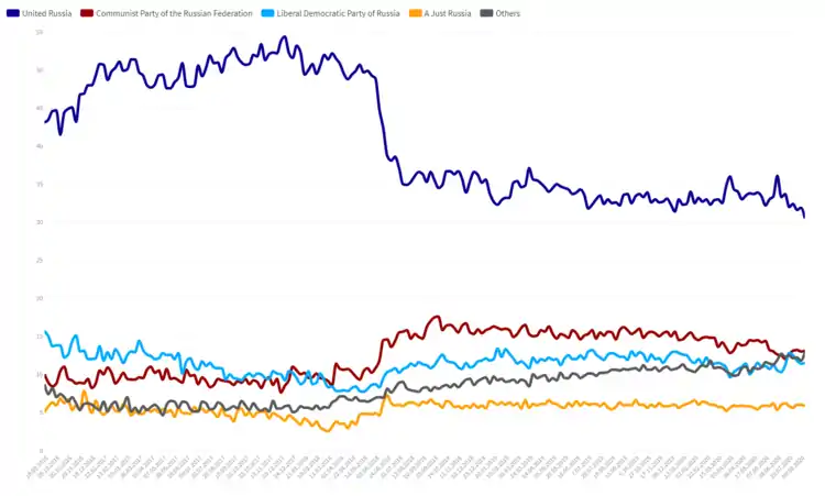 | 20 вересня | ВЦИОМ[23] | 31,7 | 11,6 | 14,1 | 6,7 | — | — | — | — | — | — | — | 13,4 |