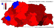 На цих перших формально-демократичних парламентських виборах у країні прем’єр-міністр Бутану Джігме Тінлей очолював Партію миру і процвітання; PDP очолював колишній прем’єр Сангай Нгедуп, який зрештою програв вибори у своєму окрузі. Обидві партії декларували чіткий монархічний курс, зокрема, проголошували за свою мету збільшення «валового національного щастя». Оскільки DPT здобула 45 з 47 місць у Національній асамблеї, Тінлей отримав право на формування уряду. При цьому за PDP було віддано 67,04 % голосів, а за PDP — 32,96 %.
