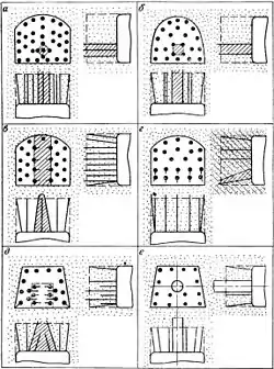 - спіральний — прямий несиметричний вруб, утворений незарядженим шпуром (свердловиною) і декількома зарядженими шпурами, які висаджуються послідовно і розташовані на поступово зростаючій відстані (по спіралі) від центрального;