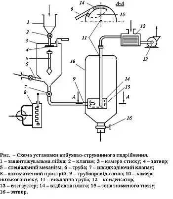Руйнування частинок при вибухово-струминному подрібненні відбувається в основному при русі матеріалу по трубопроводу-соплу. Завдяки різкому спрацьовуванню швидкодіючого клапана, а також великому перепаду тиску (між камерами високого і низького тиску) швидкість руху робочого газоподібного середовища миттєво досягає швидкості звуку. Це служить причиною утворення звукових ударних хвиль, що поглинаються і відбиваються міжзерновими поверхнями, які є границями розділу середовищ з різними проникностями. У результаті виникають напруження на міжзернових границях, що є однією з причин руйнування частинок. Найбільш інтенсивний етап руйнування має місце на зрізі трубопровода-сопла при вході в камеру низького тиску. Різниця внутрішнього (в об'ємі частинки) і зовнішнього (в камері) тиску приводить до розвитку тріщин. Остаточно процес руйнування завершується при ударі частинок з ослабленою міцністю об відбійну плиту або при зіткненні зустрічних потоків.