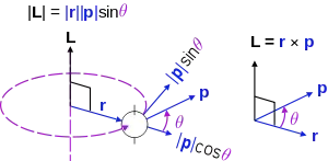 Момент імпульсу Густина електричного струму Форма частки N/A Форма добутку Починаючи з того, що оскільки L = 0 коли p і r are паралельні чи перетинаються, найбільше значення, коли перпендикулярні, тому для компоненти p справджується |p| sin θ, величину кутового моменту L слід записувати: