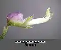 Квітконоси з китицею за довжиною дорівнюють листкам або трохи перевищують їх. Листочки розміщені в одній площині. Квітки на коротких квітконіжках без покривних листків і приквіток, в однобоких пазушних китицях з довгими квітконосами, які за довжиною дорівнюють суцвіттю або перевищують його. Чашечка світло-бузкова, неправильна, з 5 зубцями, з яких два верхні широко-трикутні, короткі, інші майже шилоподібні, з них нижній — найдовший. Віночок теж світло-бузковий, 1-1,5 см завдовжки. Прапорець (вітрило) з дуже коротким нігтиком. Нижня половина відгину широко-овальна із загнутими всередину краями, які охоплюють нігтики решти пелюсток, верхня половина обернено-яйцеподібна, на верхівці виїмчаста, з темними поздовжніми жилками, на початку цвітіння вздовж складена, притиснута до крил (весел), після запилення відхиляється догори. Крила (весла) з довгими безколірними білуватими лінійними нігтиками, які майже дорівнюють довгастим або ланцетно-видовженим, тупим, ввігнутим з боків відгинами, які несуть при основі широку трикутну лопать. Човник з довго-нігтикових пелюсток, зрослих між собою відгинами, тупий, світло-бузковий, з темною плямою у верхній частині. Андроцей двобратній, тичинкова трубка косо зрізана; пиляки овально видовжені, вільні кінці тичинкових ниток під пиляками різко звужені. Маточка з довгою, стиснутою з боків, в обрисах лінійно-довгастою зав'яззю, з 6-8 насінними зачатками. Нижня частина зав'язі, яка позбавлена насінних зачатків, звужена. Приймочка та верхня частина стилодію, яка розширюється під приймочкою, волосисті. Плід — лінійно-довгастий, брудно-коричневий біб, який розкривається двома стулками.