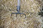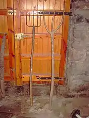 - ґаблі чи «картопляні» вила — залізні вила з тупими, кулькуватими відлитими кінчиками, що слугують для перекидання картоплі, буряків тощо. Слово «ґаблі» походить від нім. Gabel («вила», «виделка», «вилка»)[1] У деяких місцевостях України (наприклад на Вінниччині, Волині) ґаблями зазвичай називають залізні вила з тупими, кулькуватими відлитими кінчиками. Зазвичай ґаблі ширші, ніж звичайні вила. Їх використовують для перекидання картоплі або буряків. А щодо інструмента з гострими зубцями вживається термін «вила». Борис Грінченко в своєму «Словарі» тлумачить ґаблі (каблі) як «вила з трьома вістрями»[7][8].