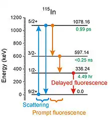 - Якщо початковим станом ядра-мішені є його основний (найнижчий) стан, то флуоресцентні фотони матимуть менше енергії, ніж енергія падаючого фотона (як видно на схематичному малюнку). Оскільки канал розсіювання, як правило, найсильніший, він може "засліпити" прилади, що використовуються для виявлення флуоресценції, і ранні експерименти віддали перевагу дослідженню ВГВ шляхом використання імпульсів від джерела падаючих фотонів, коли детектори були вимкнені, а потім концентруються на будь-яких затриманих фотонах флуоресценції, коли інструменти вже можна було безпечно ввімкнути.