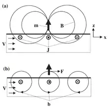 На основі викладеного вище, при перетині потоку рідкого металу і ліній магнітного поля (яке, в свою чергу, генерується катушкою зі струмом або постійним магнітом), виникаючі вихрові струми генерують силу Лоренца (густиною ) . Згідно визначенню: