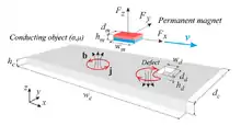 Сучасна методика, що називається дефектоскопією силою Лоренца,[22][23] має суттєву перевагу за рахунок використання постійного магнітного поля і взаємного переміщення матеріалу та джерела магнітного струму, що дозволяє глибоко і відносно швидко дослідити електропровідний матеріал. Загалом, СДЛ являє собою модифікацію традиційної струмовихрової дефектоскопії, з якої можна виділити два аспекти: (1) як генеруються вихрові струми і (2) як реєструються їх збурення. В СДЛ вихрові струми генеруються за рахунок взаємного переміщення досліджуваного провідника і постійного магніту (Рис. 10). Коли магніт проходить над дефектом, сила Лоренца, що діє на нього, викривляється і виявлення цього викривлення є основним принципом вимірювання у СДЛ. Якщо досліджуваний об'єкт не містить дефектів, результуюча сила Лоренца залишається сталою.