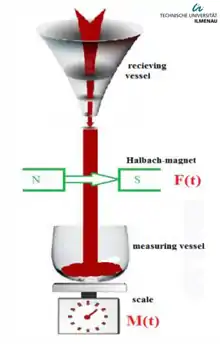 Досліджувана рідина, що протікає по каналу, до досягнення частини каналу з вимірювальними системами проходить спеціальний пристрій для створення сильних збурень — генератор вихрів. Коли створений таким чином вихор досягає магнітного поля вимірювальної системи, вона фіксує збурення вимірюваної сили і на її профілі сили спостерігається пік, так як через другу вимірювальну систему все ще протікає стабільний потік. Після цього вихор досягає другої системи і пік спостерігається на другому профілі сили. Так як відстань між вимірювальними системами точно відома, а час між піками можна визначити за допомогою перехресної функції, швидкість потоку може бути визначена як відношення відстані до часу. Якщо прийняти до уваги, що об'ємна витрата рідини у каналі незмінного перерізу дорівнює добутку швидкості та площі перерізу, витрата рідини може бути розрахована за допомогою наступного виразу: