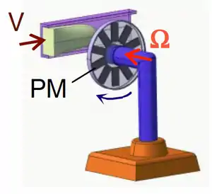 Принцип вимірювання за допомогою витратомірів обертання базується на використанні обертових постійних магнітів [9] (або масиву постійних магнітів, які закріплено на диску, як можна зрозуміти з рис. 4). Лінії магнітного поля постійних магнітів перпендикулярні поверхні, в яку вони вбудовані. Коли подібна система розташована поруч з каналом з рухомою електропроводною рідиною, диск обертається так, що рухомий момент, який виникає в результаті дії вихрових струмів, зрівноважується за рахунок гальмівного моменту, який виникає в результаті самого обертання диску. Швидкість обертання при цьому прямо пропорційна швидкості потоку та обернено пропорційна відстані між магнітом та каналом. У цьому випадку можливо вимірювати як момент обертання, так і кутову швидкість магнітної системи.