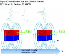 Первинне магнітне поле може бути індуковане під впливом постійного магніту або первинного струму (див. Рис. 1). У рідині, що рухається крізь первинне магнітне поле, виникають вихрові струми. Вони позначені як і називаються вторинними струмами. Взаємодія первинних струмів та первинного магнітного поля індукує силу Лоренца, яка гальмує рух рідини