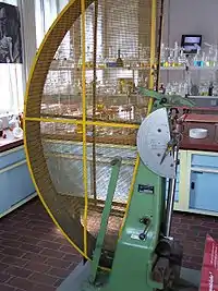 Схема положень маятникового копра приведена на малюнку праворуч. Маятник 1 відводиться на кут α і кріпиться клямкою. Після відкидання клямки маятник падає, руйнуючи зразок 2, і за інерцією відхиляється на кут β Кути α і β відлічуються за положенням стрілки на шкалі 3.