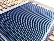 Система сонячного нагріву води на основі колектору із скляних трубок. Сонячне світло поглинається кожною трубкою із селективною поверхнею. Поверхня поглинає сонячне світло майже повністю і має низьку теплову випромінювальну здатність, тому вона майже не втрачає тепла. Звичайні чорні поверхні також поглинають сонячне світло ефективно, але вони в значній кількості розсіюють тепло. - Сонячні теплові колектори - так само, сонячні теплові колектори втрачають тепло випромінюючи тепло. Модернізовані сонячні колектори мають селективні поверхні з низьким коефіцієнтом випромінення. Такі теплові колектори втрачають дуже мало сонячної енергії через випромінювання теплової енергії.[4]