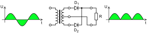 - двопівперіодні — пропускають в навантаження обидві півхвилі;