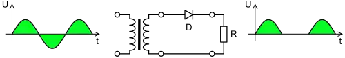 На рисунку показана схема й принцип дії напівперіодного випрямляча. Використовуючи односторонню провідність напівпровідникового діода, струм у зворотному напрямку відтинається.