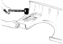 Випрямляння проводиться шляхом нанесення частих але не сильних ударів сталевими молотками або молотками з м'якого матеріалу по певних місцях, сила ударів повинна бути відповідною до величиною опуклості і товщини виробу що правиться. Поверхня правильної плити, а також бойки молотків повинні бути рівними, гладкими і добре прошліфованими. При ручному випрямлянні зручніше користуватися молотками з круглим, а не з квадратним бойком, оскільки при неправильних ударах або при перекосах молотка з квадратним бойком на поверхні виробу можуть залишитися сліди у вигляді зарубок або навіть пробоїн. Бойок молотка повинен лягати на лист рівно, без перекосу. Молоток слід тримати за кінець ручки і для удару користуватися тільки кистю руки. У міру наближення до опуклості удари повинні наноситися слабкіше, але частіше.
