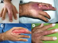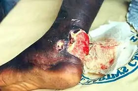 ![]() Типова виразка Бурулі на лівій руці у 17-річного хворого з Нігерії. Типова виразка Бурулі на лівій руці у 17-річного хворого з Нігерії. | |