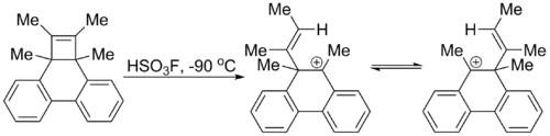 Вироджені перегрупування часто зустрічаються у карбокатіонах, зокрема як [1,2]-зсуви. Цікавим прикладом такого виродженого перегрупування є [1,2]-міграція вінільної групи у 9,10-диметил-9-вінілфенантренієвих йонах, що генеруються дією суперкислот [5] [6]