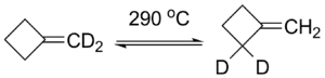Методом ізотопної мітки було показано, що метиленциклобутан при нагріванні вступає до радикального виродженого перегрупування: дидейтерометиленова група переміщується усередину циклобутанового кільця[7]: