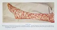 - Плями різного походження і розмірів — черевний тиф, паратифи, епідемічний висипний тиф, псевдотуберкульоз, краснуха, менінгококова інфекція, скарлатина, короста, висівкоподібний (різнокольоровий) лишай, еритразма, епідермофітія на початковій стадії, руброфітія, мікроспорія на початковому періоду, багатоформна ексудативна еритема, червоний плоский лишай, рожевий лишай, бешиха, простий дерматит, алергічний дерматит, токсикодермія, саркома Капоші, лепра на ранньому етапі, дерматоміозит, сифіліс в 1 і 2-му періоді, геморагічний васкуліт тощо.