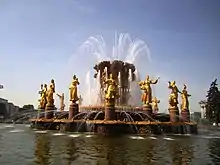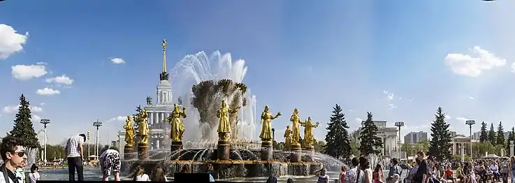 Фонтан «Дружба народів», що стоїть на Центральній площі виставки, є одним з символів ВДНГ. Збудований у 1954 р. за проектом Костянтина Топурідзе і Г. Д. Константиновського. Має вигляд 7,4-метрового чашоподібного снопа пшениці, конопель і соняшників, виготовленого з листової міді і встановленого на основі з червоного граніту. Центральну частину оточують 16 фігур дівчат, що представляють союзні республіки СРСР (разом з Карело-Фінською РСР, у 1956 році включеною до РРФСР). Статуї виконані з бронзи й покриті сухозлітним золотом, кожна дівчина вдягнута в національний костюм і тримає плоди чи рослини. Якщо дивитися від Центрального павільйону, прямо стоять три слов'янські республіки — УРСР, РРФСР, БРСР. Фонтан розміщено у восьмикутному басейні розміром 81 на 56 метрів.