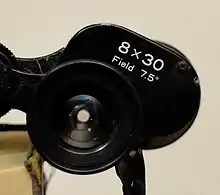 У випадку з біноклем, два окуляри, як правило, постійно прикріплені, а збільшення та діаметр об'єктива (у мм) зазвичай наносяться на біноклі у формі, наприклад, 7 × 50. У цьому випадку вихідну зіницю можна легко розрахувати як діаметр лінзи об'єктива, поділений на збільшення. Ці дві формули, звичайно, еквівалентні, і це просто питання, з якої інформації починається, яку формулу використовувати.