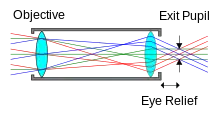 Щоб використовувати оптичний інструмент, вхідна зіниця очей глядача повинна бути вирівняна з розміром вихідної зіниці інструменту та мати такий самий розмір. Це належним чином прив’язує оптичну систему до ока і дозволяє уникнути віньєтування. (Вхідна зіниця ока — це зображення анатомічного зіниці, яке видно через рогівку.) Розташування вихідної зіниці, таким чином, визначає рельєф окуляра. Хороші конструкції окулярів дають вихідну зіницю діаметром, яка наближається до видимого діаметру зіниці ока, і розташована близько 20 мм для останньої поверхні окуляра для комфорту глядача. Якщо диск більше зіниці ока, світло буде втрачатися замість потрапляння в око; якщо менший, вигляд буде віньєтованим. Якщо диск знаходиться занадто близько до останньої поверхні окуляра, очі доведеться дискомфортно закривати для перегляду; якщо занадто далеко, спостерігачеві буде важко підтримувати вирівнювання ока з диском.
