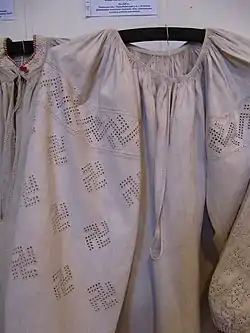 - «…13 хусток ріжних і вишиваних, 12 сорочок різних, так зі золотом як вишиваних так і простих… По цьому списку найбільше з біля було сорочок, в обох рубриках 87, це свідчить про велику заможність купця Афендика.» (Опис майна заможного львівського купця Афендика): «Не більше сотні років тому, ще коли в зв'язку з соціальними умовами національний одяг тримався в вищих соціальних станах суспільства, вишивку на полотні виконували кольоровим шовком з додаванням срібної та золотої нитки. Тепер ці матеріали можна зустріти в плахтах заможних козачок лівої сторони Дніпра. В одязі звичайного народу вишивки шовком виконуються дуже рідко.» (1874 p.)[11]