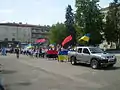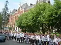 Вишиванка-фест 2012 у Дрогобичі. Рух колони повз Монастир святих Апостолів Петра і Павла (Дрогобич). На стіні будинку мозаїка, на якій зображені дрогобицькі священномученики Севірян Бараник, Яким Сеньківський та Віталій Байрак.