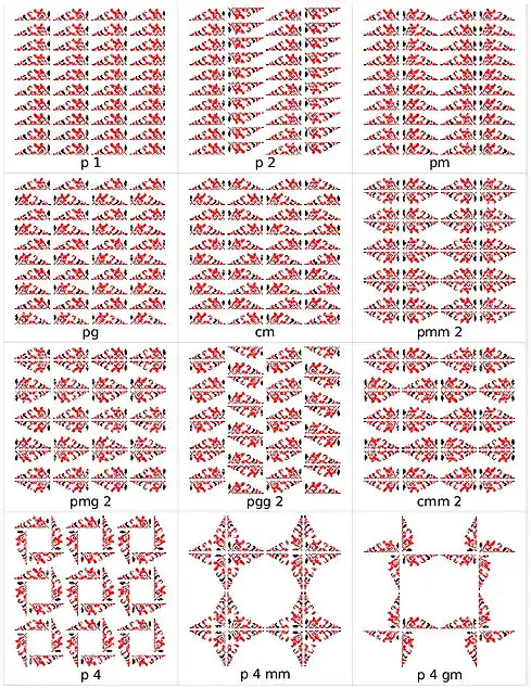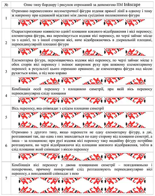 Симетрія є одним із найбільш яскравих композиційних засобів, з допомогою якого створюють елементи вишивки (орнаменти). Вивчення орнаментів вишивки не обмежується знаннями про їх види, колірне вирішення чи інші характеристики зовнішнього виду. Важливою складовою є спосіб утворення композицій орнаментів і їх розміщення на площині.Для створення бордюрів - лінійних орнаментів використовують такі перетворення: паралельний перенос; дзеркальна симетрія з вертикальною віссю; дзеркальна симетрія з горизонтальною віссю; обертова (центральна симетрія). Найбільш поширеними в вишивці хрестом смуги орнаментів вишивок- бордюри [15]. Всього існує 7 типів симетрій бордюрів. Створення бордюрів (орнаментальних смуг) виконано за допомогою програми Inkscape. Бордюри (отримані з урахуванням українських національних традицій) можна використовувати для оздоблення сучасних жіночих костюмів [15]. Хоча розрізняють 17 груп симетрії решіткових орнаментів, визначено, що в українському народному одязі використовували лише 12 груп [15].