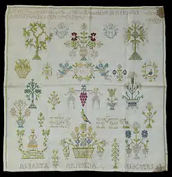 Зразки вишивки хрестиком створювали зазвичай молоді дівчата, які в процесі навчання вишивали літери абетки та інші візерунки. В подальшому ці візерунки слугували зразками протягом багатьох років. Найчастіше елементи орнаменту та ініціали вишивали на різних речах, що використовувались у побуті, для ідентифікації власника або просто для прикрашання одноколірного одягу. В США найдавніший зразок вишивки хрестиком зберігається в музеї Пілігрим Хол у Плімуті, штат Масачусетс.[3] Цей зразок був створений приблизно у 1653 р. Лорою Стендіш, дочкою капітана Майлза Стендіша, яка першою використала левіятанський шов у вишивці.