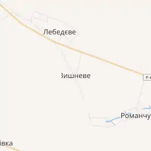 Село Вишневе розташоване у одного із витоків річки Терн. Примикає до села Лебедєве.