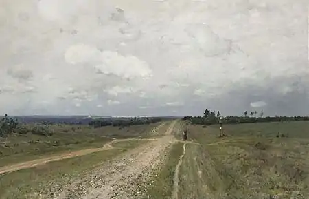 На картині зображена безкрайня рівнина з пролягає по ній дорогий, яка простягнулася від переднього плану в глибину, проходячи через поля, повз перелісків і селищ, і гублячись у синій імлі у самого горизонту. Вузькі стежки, протоптані уздовж дороги по обидва боки, підкреслюють її протяжність. Крім цього, через все полотно зліва направо проходить ще одна стежка. Перетинаючи дорогу, вона уповільнює рух погляду глядача і направляє його на придорожній стовпчик-голубець, поруч з яким з торбинкою за плечима стоїть мандрівниця-прочанка. Пустельність дороги, навислі над нею хмари, самотня постать Мандрівниця, яка звернулася з молитвою до ікони на стовпчику-голубці, — все це створює тривожну і обтяжливу атмосферу, навіяну думками про що проходили тут тисячах ув'язнених. І тільки сонячний просвіт у горизонту, так біліють далеко церква уособлюють собою промінь надії