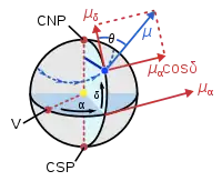 де δ — схилення. Множник cos δ враховує той факт, що умовний радіус кола небесної сфери зменшується як cos δ, наприклад, стає нульовим на полюсі. Тобто внесок компоненти руху, паралельної небесному екватору, у загальну величину зменшується з наближенням до полюсів[6].