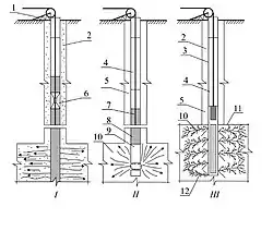 На рис. (схема ІІІ) показаний ефективний метод створення розгалужених тріщин утворенням вибухових речовин безпосередньо у зоні вибуху за допомогою хімічних реакцій невибухових композицій з подальшим порушенням детонації цих речовин. Для цього частина свердловини в зоні пласта заповнюється реагентами (одним з них може бути вода, іншим — карбід кальцію, розміщений в капсулі, що вибухає відрізком детонуючого шнура). Після запалювання в зоні реакції ацетилену збільшується тиск і ацетилен нагнітається в тріщинно-поровий простір гірських порід. При досягненні тиску 2–4 МПа ацетилен детонує із значним виділенням теплоти, що посилює утворення тріщин.