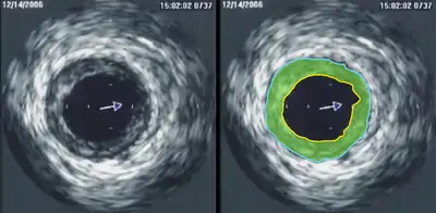 Важкі відкладення кальцію в стінках кровоносних судин сильно відбивають звук, тобто дуже ехогенності, і при УЗД виглядають як дуже яскраві ділянки з тінню позаду (відповідно до положення катетера, що випромінює ультразвукові хвилі).