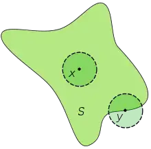 Точка Х є внутрішньою для множини S, а точка У — ні, оскільки будь-який її окіл виходить за межі множини S.