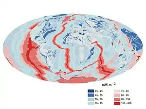 Глобальна карта потоку тепла, в mW/m2, від внутрішньої поверхні Землі до поверхні. Найбільші значення теплового потоку збігаються з середніми хребтами океану, а найменші значення теплового потоку виникають у стабільних континентальних інтер'єрах.