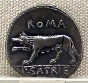 Вовчиця та близнюки з’явилися на найпершій срібній монеті, викарбованій у Римі. [9]