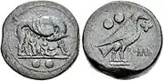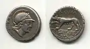 Вовчиця на монеті з 77 р. до н.е. З головою Марса з іншого боку.