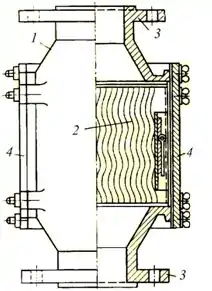 Вогневий запобіжник: 1 — корпус; 2 — касета; 3 — приєднувальні фланці; 4 — кришки