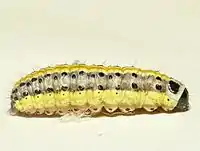 Розмах крил становить 27-31 мм. Передні крила блідо-жовті з темними краями. Задні крила жовто-білуваті. Личинка блідо-жовта; спинна лінія темніше; боки блідо-фіолетові; плями на бічній лінії чорні; голова чорна.[1]