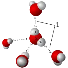 Завдяки своїй формі молекули води можуть сполучатись водневими зв'язками із чотирма іншими. Саме таким чином вони організовані у кристалах льоду. Проте в рідкій воді молекули менш впорядковані та перебувають у стані постійного руху, тому середня кількість зв'язків, що утворюються кожною із них, в будь-який момент часу становить 3,6[5].