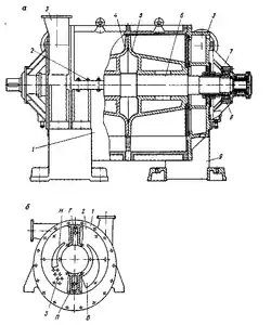 Кришка 1 з розподільним диском 2 (рис. 1. б) утворює чотири відсіки, кожен відсік сполучений з циліндром отвором: В – всмоктувальним, Н – нагнітальним, П – підведення води у водяне кільце і Г – підведення води у гідрозатвор. Відсіки зовні мають патрубки з фланцями. Ущільнення зазору між розподільним диском і колесом від проходження перегрітого повітря з нагнітальної сторони на всмоктувальну здійснюється через гідрозатвор. Є також два ряди отворів, закритих гумовими клапанами 3, для автоматичного випуску повітря з нагнітального патрубка, коли тиск в колесі перевищить тиск нагнітання.