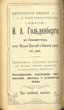 | Водолікарня Гольденберга рос. Гидропатическое заведеніе и электролечебница врача И.А.Гольденберга | |